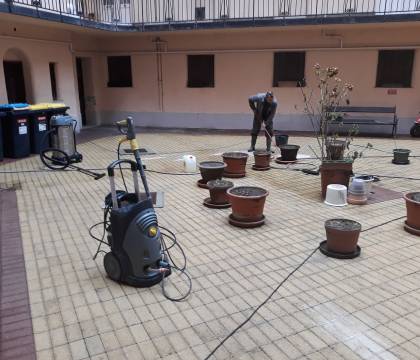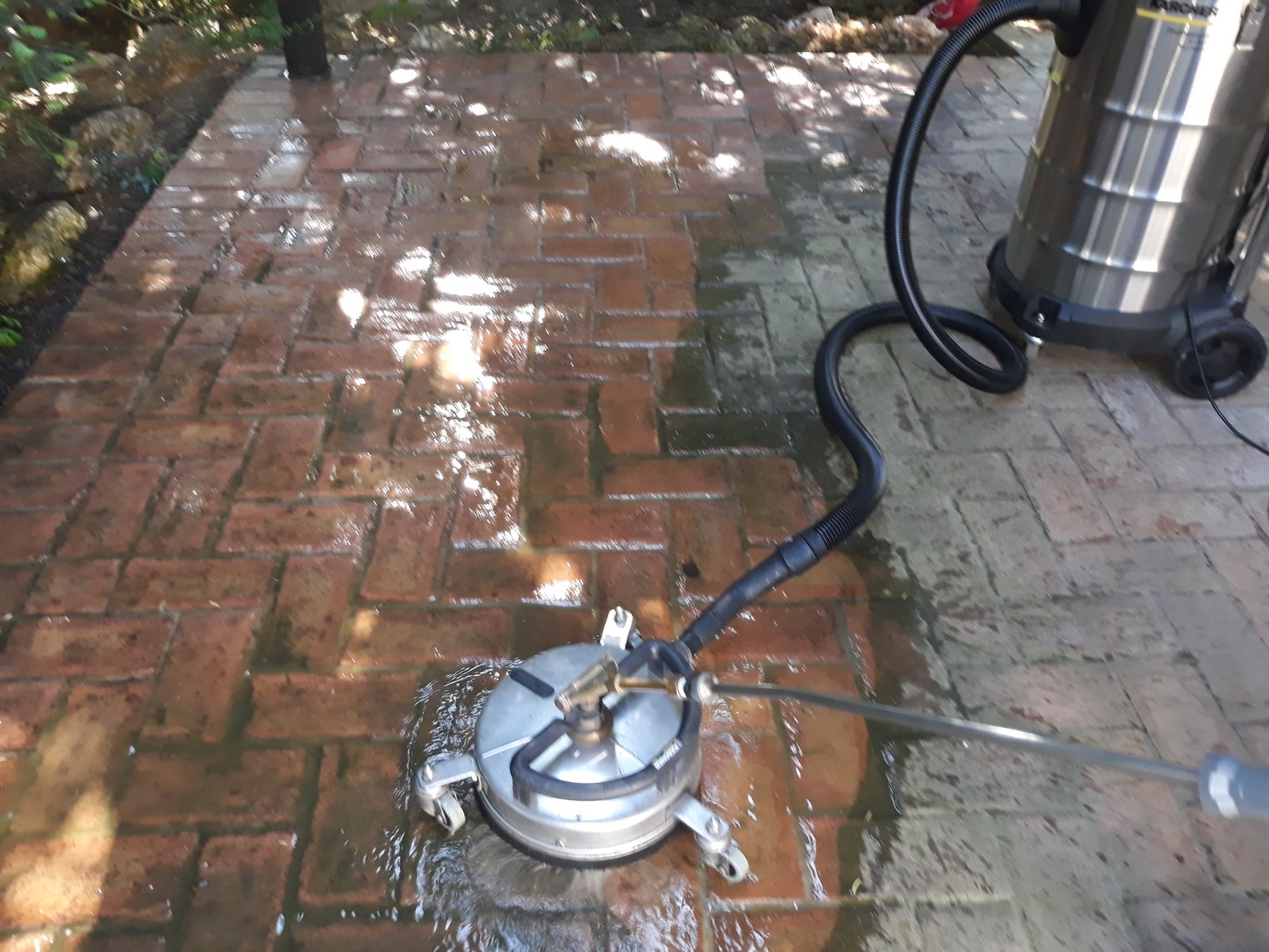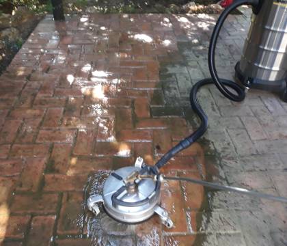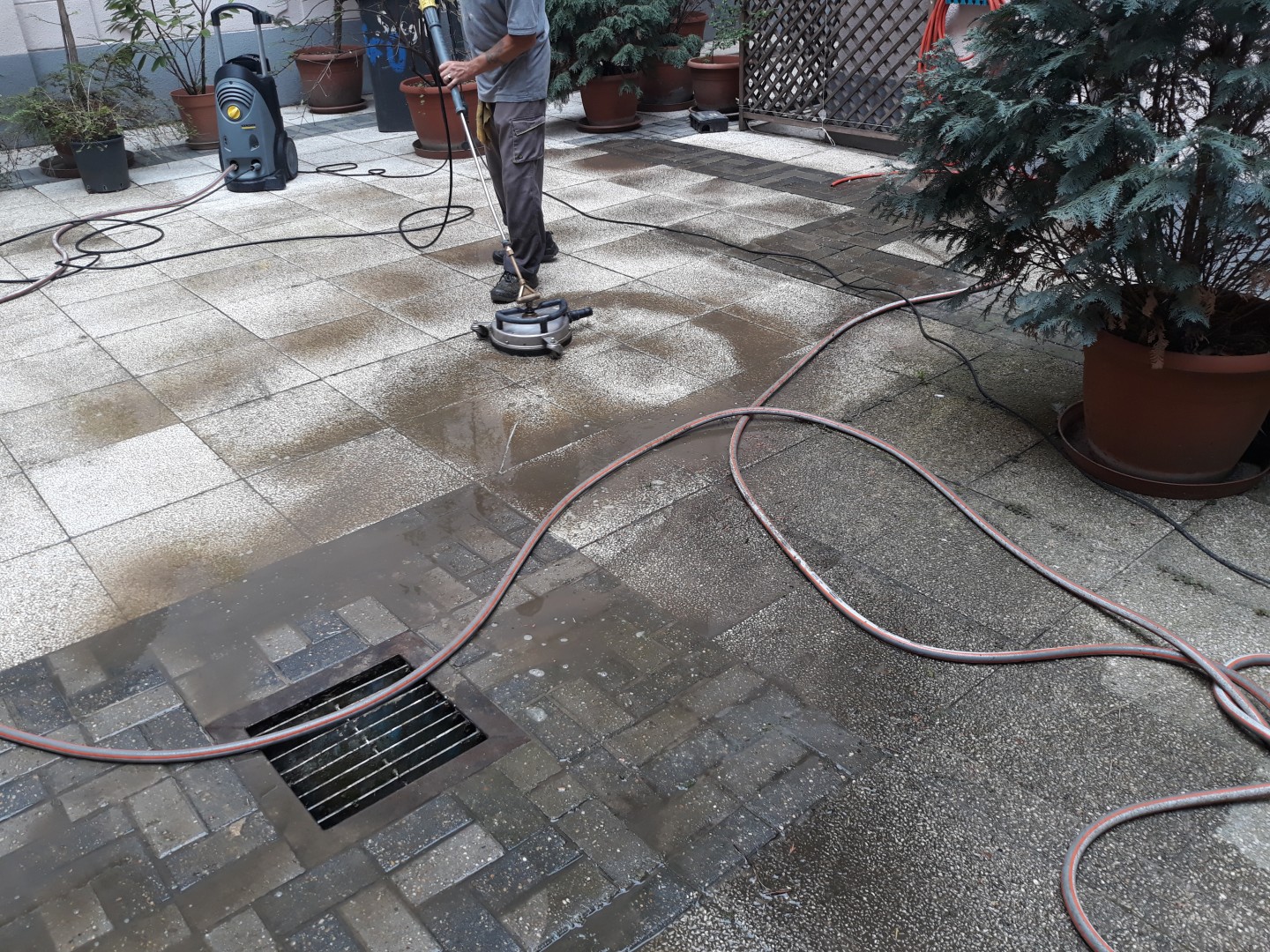 A térkő tisztításának egyik leghatékonyabb módja, ha magasnyomású vízsugárral működő berendezésekkel látunk munkához.